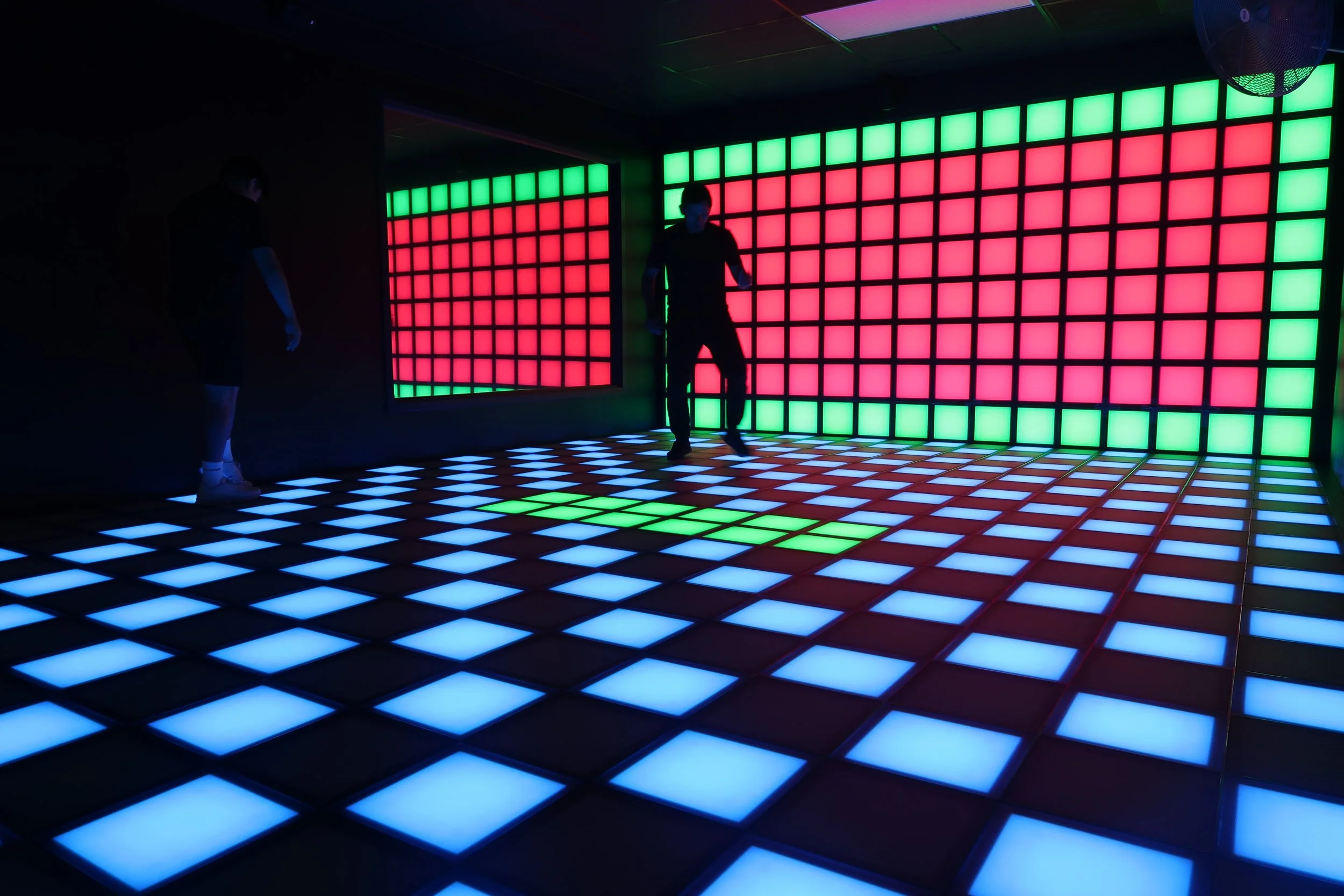 Squarena is an interactive, fast-paced experience. In each booking, play two 18-minute rounds and complete as many levels as you can! Your goal is to clear each game set by stepping on the blue tiles to pass the level. Avoid the red tiles—they cost you lives! Green tiles are safe zones where you can regroup without penalty.